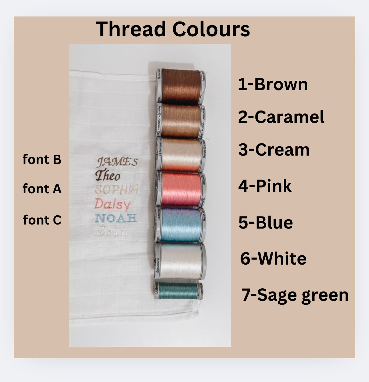 Name is embroidered over the left breast. We have two font and six thread colour options available- see the photos.