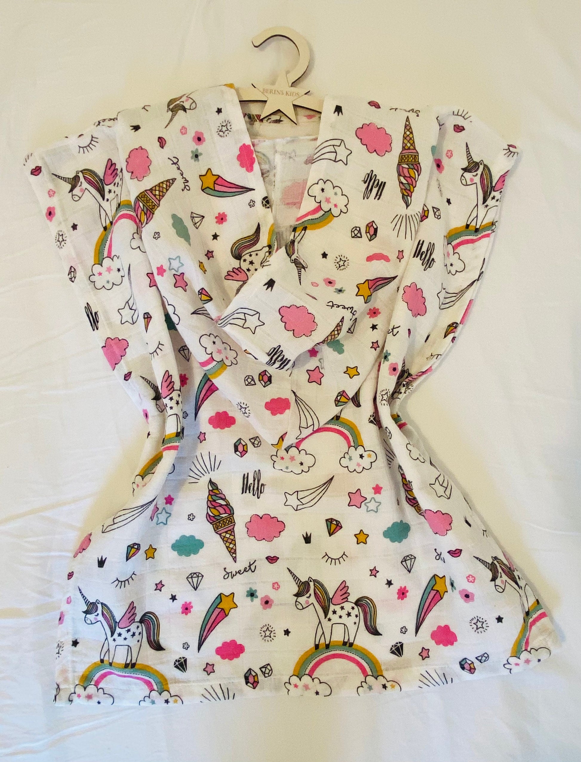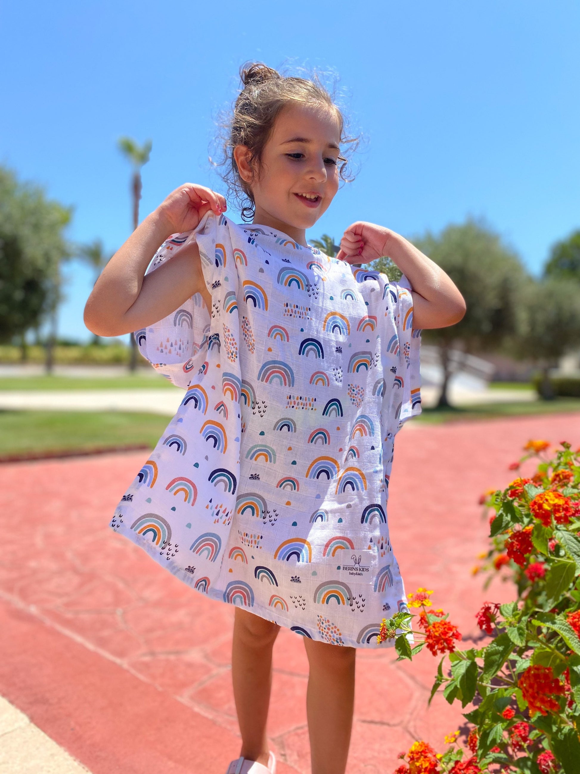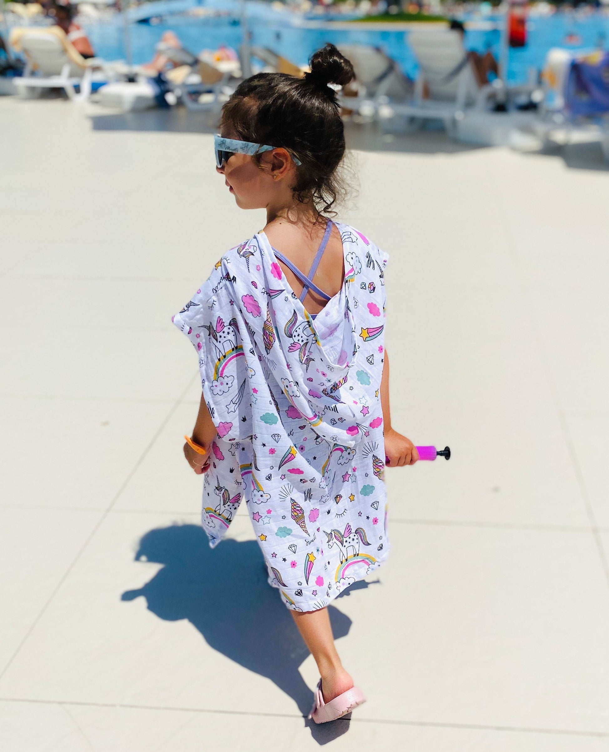Our hooded ponchos are made of Oeko-Tex certified 100% cotton muslin, soft and gentle to the skin. It is shaped in a shirt design, has two slits on the sides with snap fasteners which makes it easy & comfortable to wear and take off. Muslin Poncho can be used to protect our kids from the sun and absorbs water immediately, dries quickly and it is very lightweight. It is very comfortable to use by the beach/pool, or can be used after bathing at home. Elegant in its designs gives a nice layer over the swim suit.