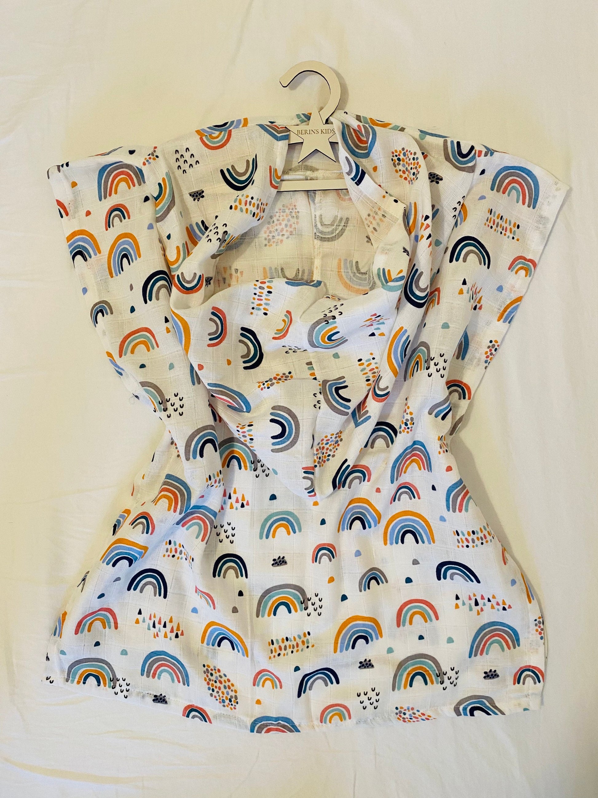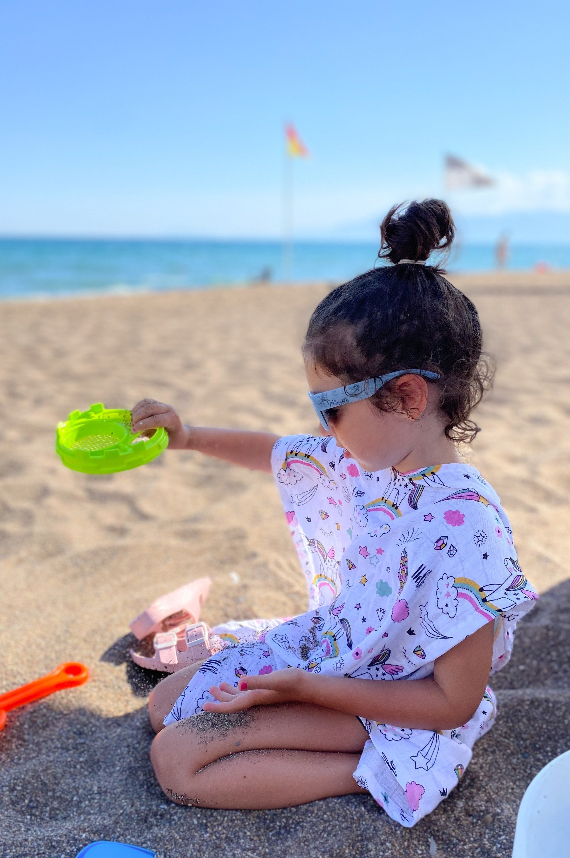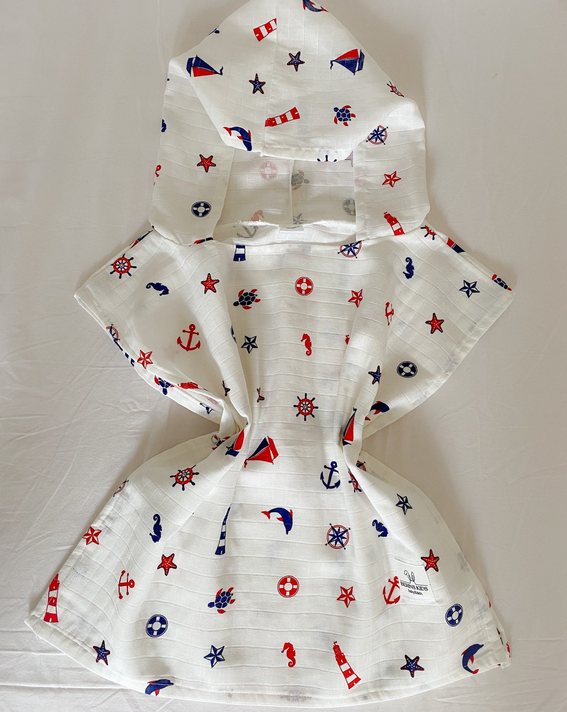 Our hooded ponchos are made of Oeko-Tex certified 100% cotton muslin, soft and gentle to the skin. It is shaped in a shirt design, has two slits on the sides with snap fasteners which makes it easy & comfortable to wear and take off. Muslin Poncho can be used to protect our kids from the sun and absorbs water immediately, dries quickly and it is very lightweight. It is very comfortable to use by the beach/pool, or can be used after bathing at home. Elegant in its designs gives a nice layer over the swim suit.